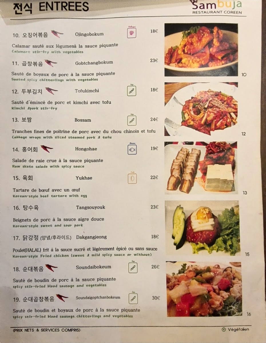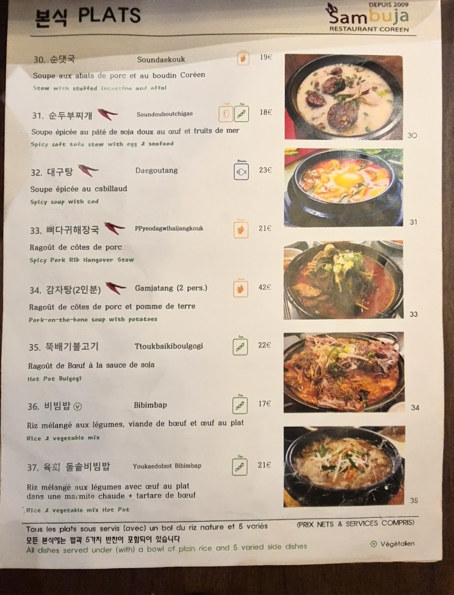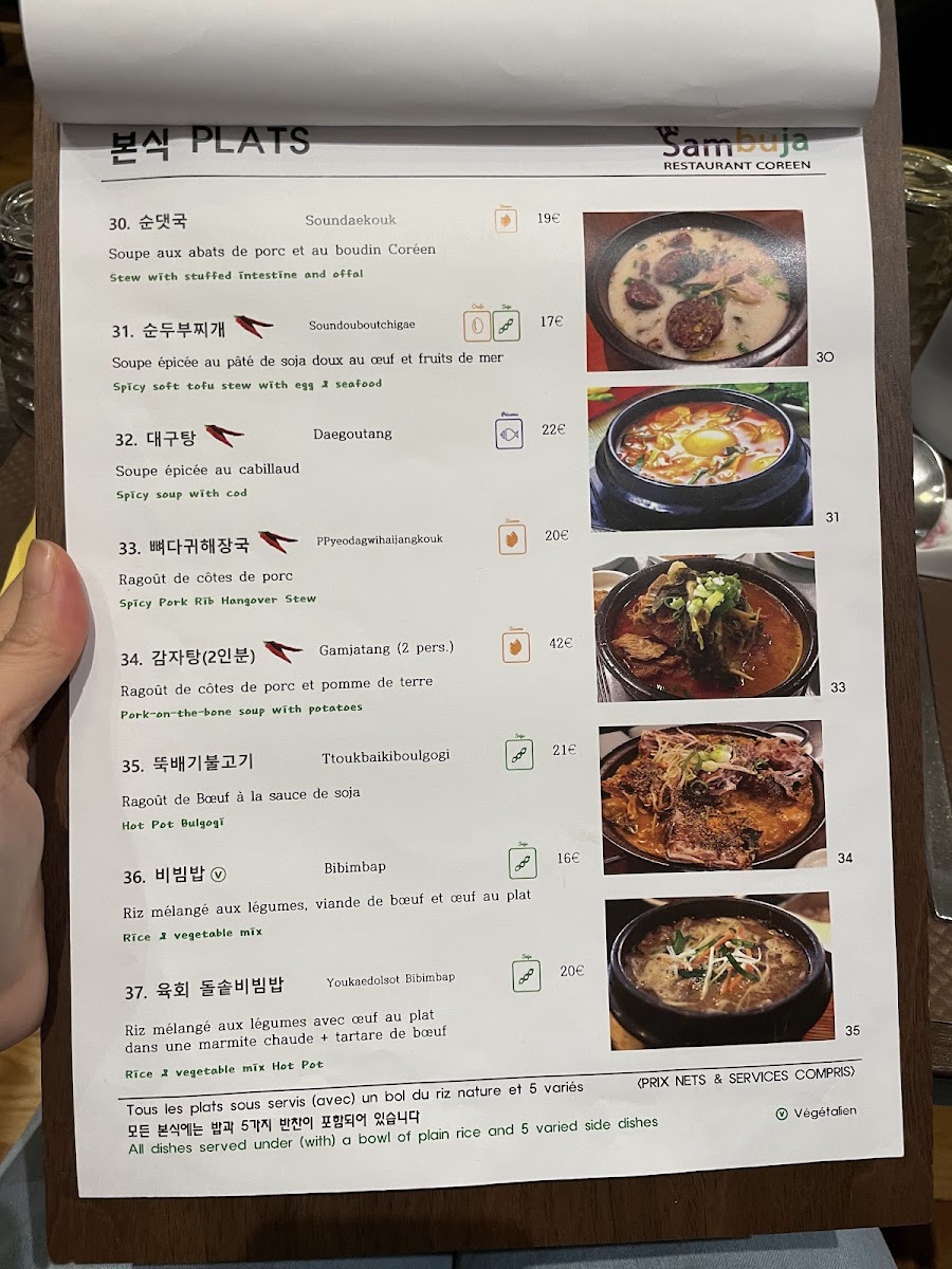 Welcome to Sambuja - Restaurant Coreen 삼부자 식당, an authentic gem nestled in the heart of Paris at 65 Rue du Faubourg Montmartre. Here, you’ll embark on a culinary journey through Korea, savoring dishes that will transport you straight to the bustling streets of Seoul. The menu features hearty delights like the 'Ragoût de Côtes de Porc' (뼈다귀해장국), which invigorates the palate with its robust flavors. Each plate comes adorned with an array of banchan, allowing you to sample the essence of Korean dining. Customers rave about the remarkably authentic experience, reminiscent of home-cooked meals in Korea. With a friendly staff ensuring quick service, Sambuja stands out as a must-visit for anyone craving the true taste of Korea. Come and relish the vibrant flavors that define this unique eatery!